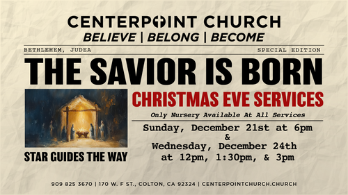 Bring your family and friends to one of our FOUR services as we worship the King of Kings and share the true and powerful Christmas story. Service times: Sunday December 21st at 6pm and Wednesday, December 24th at Noon, 1:30pm, & 3pm. Nursery available at all services for 0-23 months. All other children will remain with their family in the sanctuary.